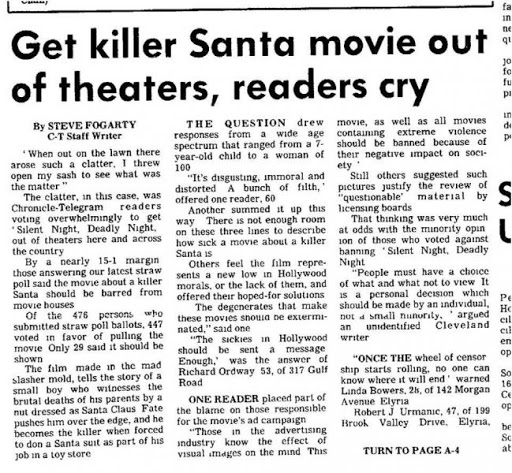 Durante el estreno y los días siguientes se acercaron a los cines familias enojadas por la imagen que daba sobre santa. El crítico de cine Roger Ebert la calificó de “bastante enferma”, pero Gene Siskel fue más allá en su programa diciendo que las publicidades de la película eran enfermos y crueles. Pero no conforme con eso pasó a nombrar a todos los que formaban parte de la película, así como la productora Tri-Star Pictures explicando que “sus ganancias eran dinero ensangrentado”.