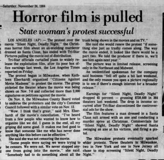 Estrenada el 9 de noviembre de 1984, el mismo día que se estrenó “A Nightmare on Elm Street “de Wes Craven e incluso le gano en taquilla, desde su anuncio considerada bastante polémica. Sus poster mostrando a un santa asesino no generaban muchos adeptos y mucho menos en la iglesia católica.