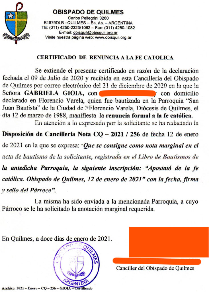 Me dirijo a Ud. con el objeto de manifestar mi voluntad de renunciar a la Iglesia Católica en los términos del Código Canónico y de la Prot. N 10.279 aprobada en el año 2006 por el Papa Benedicto XVI. A su vez, le solicito se sirva ordenar que todo registro relativo a mi persona actualmente mantenido por la Iglesia Católica Apostólica Romana sea eliminado y que la ICAR se abstenga de establecer en el futuro cualquier nuevo registro.