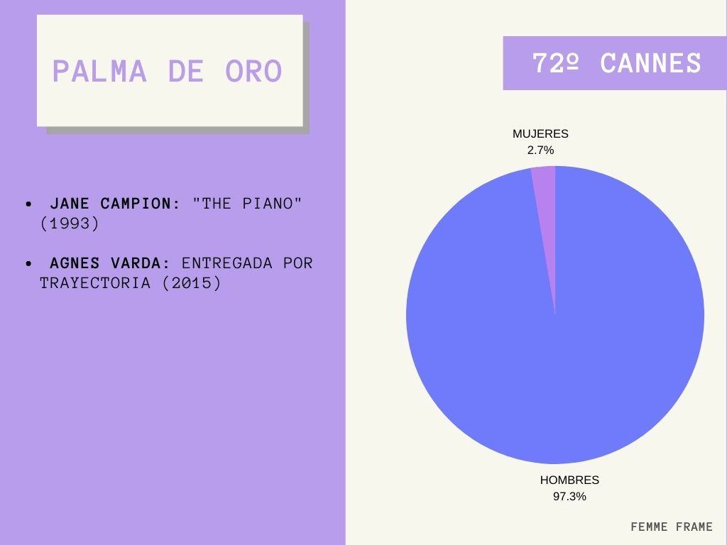 En los 72 años que existe el Festival de Cannes, la primera edición fue en 1939 pero por la segunda guerra mundial (1939-1945) se interrumpió hasta 1946, tan solo dos mujeres obtuvieron una Palma de Oro: la australiana Jean Campion, por The Piano, en 1993, y Agnès Varda, por su trayectoria como directora.